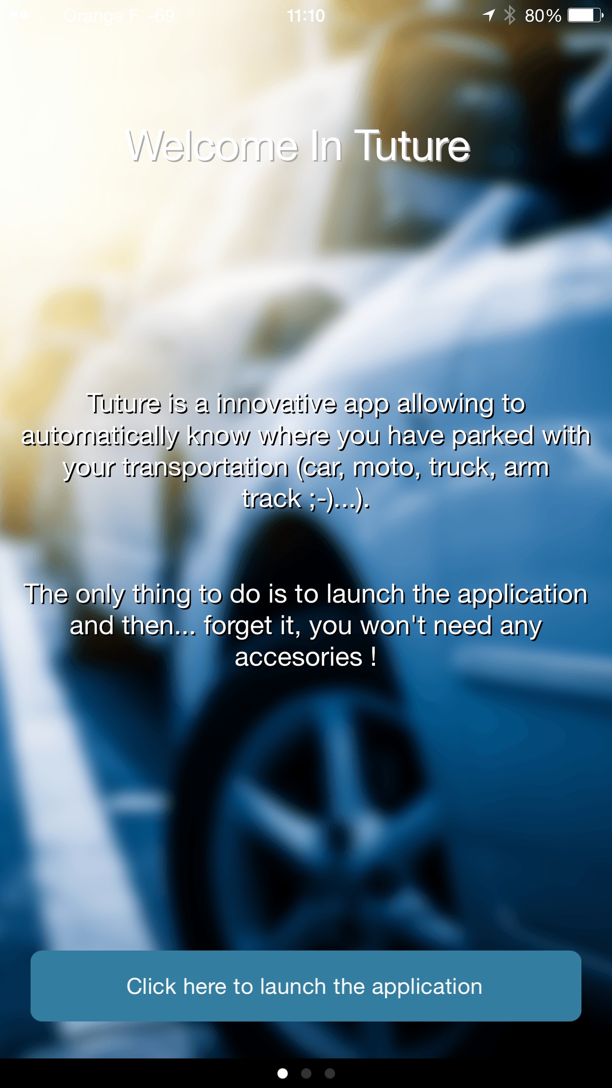 Tuture is an app that records, without any intervention, your position when you leave your car. It doesn't need any click or accessories to work automatically. If you enter a closed parking lot, Tuture will show you the parking entrance, the car entry point will be saved. If the app is disabled (low battery, app closed by mistake...), you will receive local alerts and you can click on them to relaunch the app.